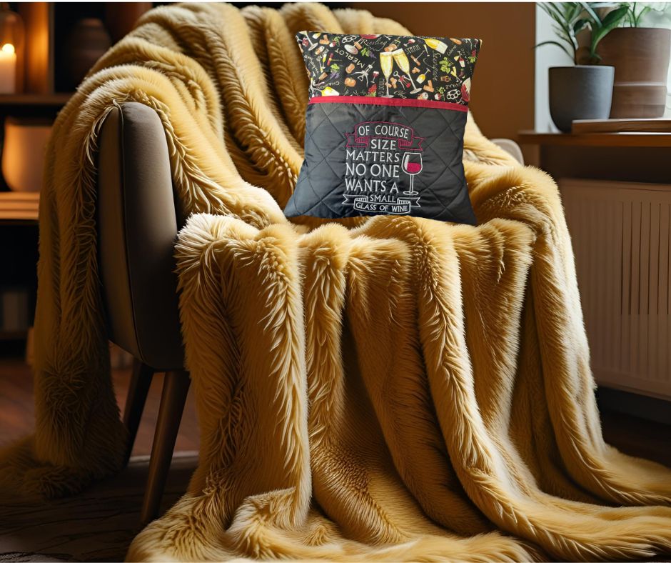 Reading cushion, approximately 16"x 16", multicoloured. Has a quilted pocket to keep your book, ipad, phone, e-reader,etc safe and at hand. Humourous embroidery on pocket reads 'Of course size matters - no one wants a small glass of wine'. Cushion has an envelope back for safety around small children and pets.